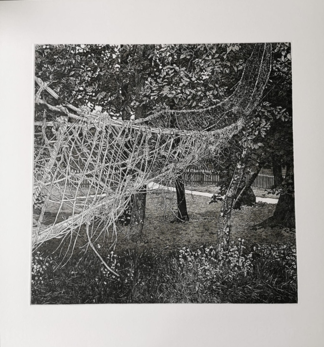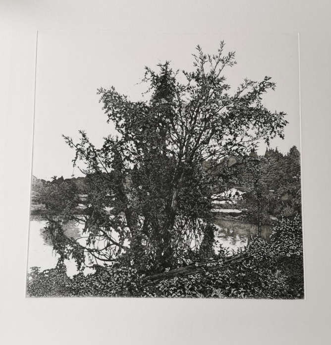 Snow falls onto the woods,resulting in a lifeless but appealing scene which the artist wants you to follow her suit. This print was collected by the Hong Kong Museum of Art in 1989.