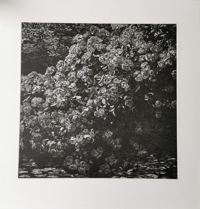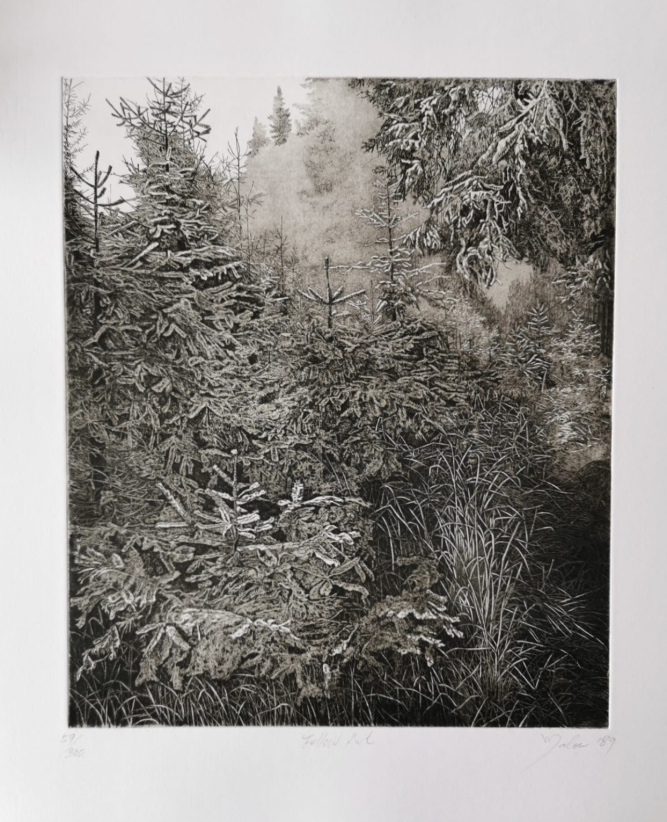Snow falls onto the woods,resulting in a lifeless but appealing scene which the artist wants you to follow her suit. This print was collected by the Hong Kong Museum of Art in 1989.